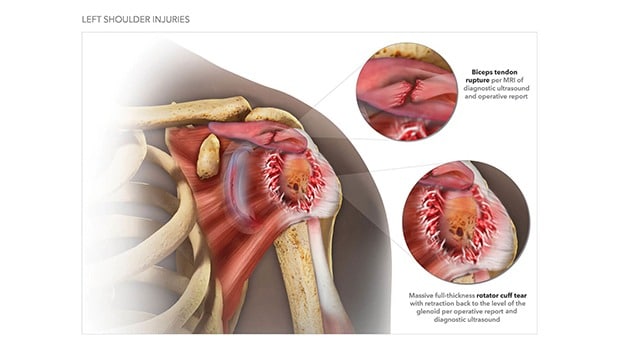 هنگام پارگی تاندون شانه، بیمار قادر نخواهد بود که شانۀ خود را به سمت بدن بیاورد و درد شدید مانع از انجام این کار میشود. همچنین بیمار توانایی بردن شانه به پشت خود را ندارد. هنگام شب نمیتواند روی بازوی آسیبدیده بخوابد.