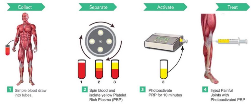 در عمل پی آر پی از فرد بیمار مقداری خون گرفته میشود، خون را در دستگاه سانتریفیوژ میریزند، تا خون با سرعت بالا بچرخد، در این مرحله پلاکت ها از سایر سلول های خونی مانند گلبول های قرمز جدا شوند. سپس پلاسمای غنی از پلاکت که حاوی پروتئین های مختلف به نام فاکتور رشد است، به طور مجدد به زانوی فرد بیمار تزریق میشود تا سبب بهبود و تحریک بازسازی محل آسیب شود. با توجه به میزان آسیب دیدگی، مقدار پلاسمای غنی شده و تعداد جلسات فرد مشخص میشود.